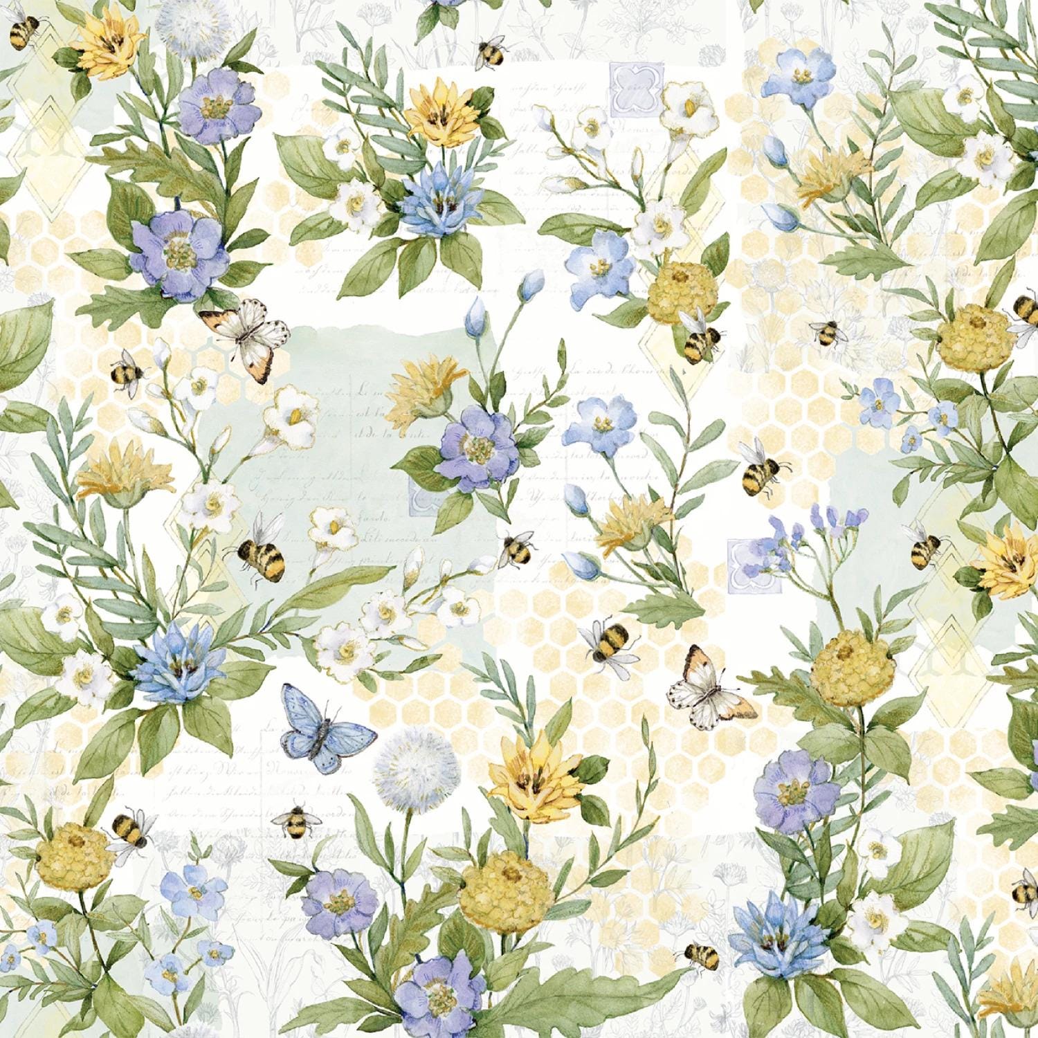 Delicate blooms of daisies, chrysanthemums, and wildflowers are artfully scattered across a creamy background, intertwined with lush green foliage and playful elements like buzzing bees, fluttering butterflies, and subtle honeycomb patterns for a touch of natural whimsy.