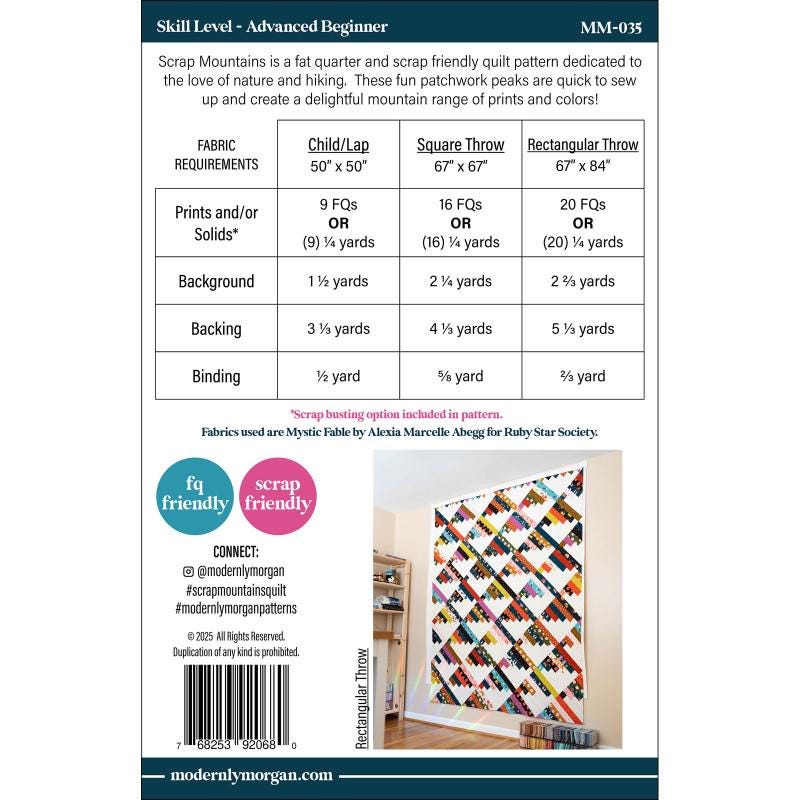 Scrap Mountains is a fat quarter and scrap friendly quilt pattern dedicated to the love of nature and hiking. These fun patchwork peaks are quick to sew up and create a delightful mountain range of prints and colors!