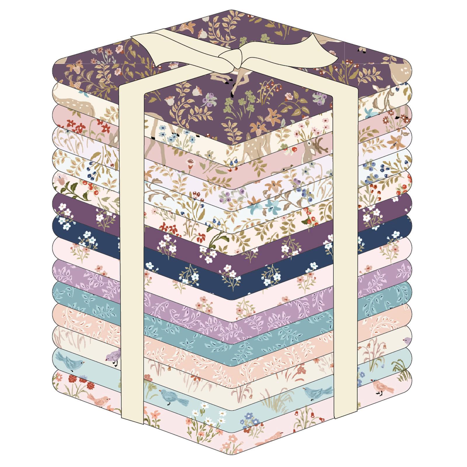 My Darling Deer is inspired by all things in nature. There are so many things that make up this sweet collection, the deer among the meadows of flowers, the tossed wildflowers, the bouquets of flowers, the tiny birds singing among the flowers and the tone-on-tone ferns. The color combination of the soft lavenders into deep plum, navy blue mixed with calming blues and pale hues of pink with cream.
