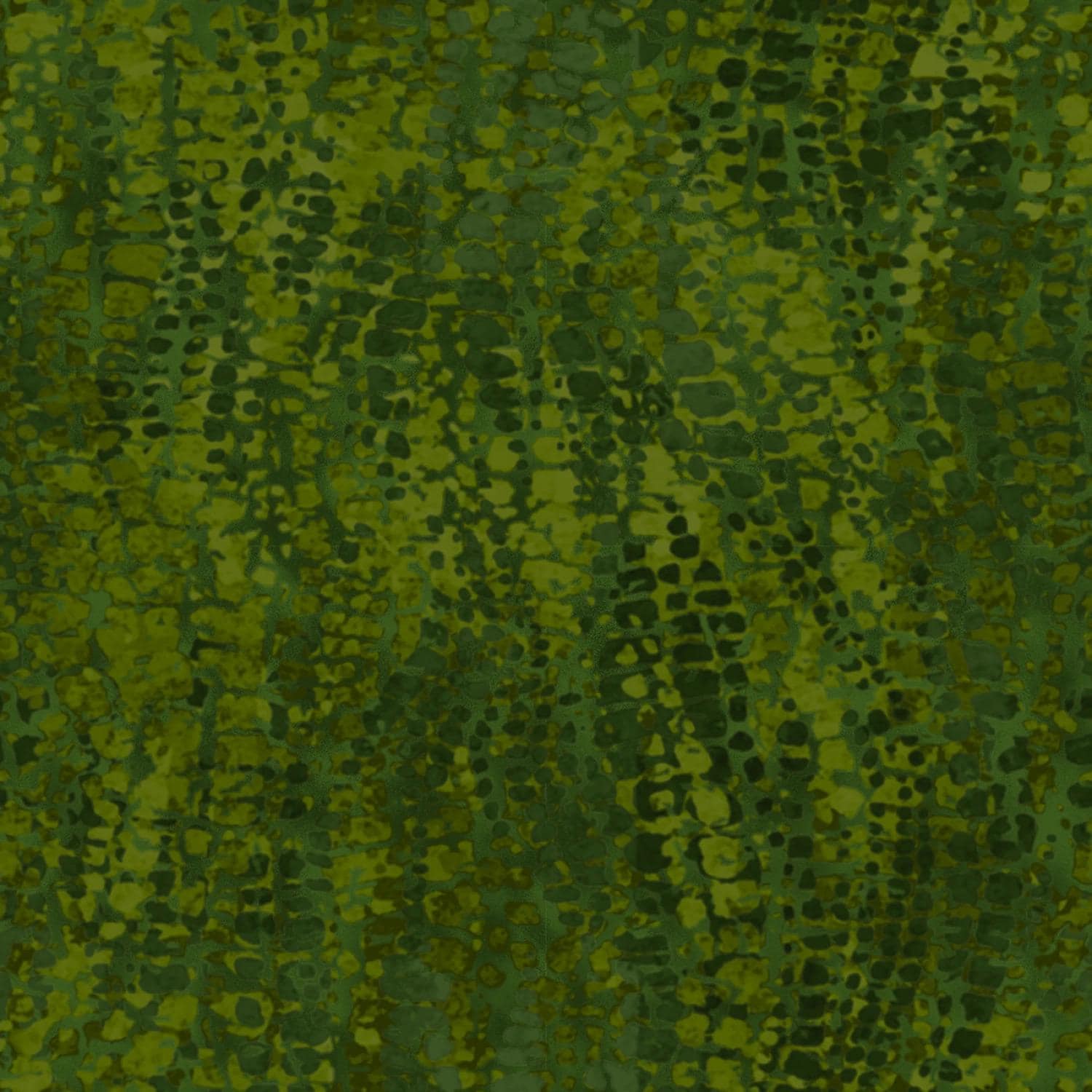 This fabric features a rich, textured design with a captivating pattern of green hues, resembling a natural, leafy environment with abstract, organic shapes. The intricate detailing provides a depth and dimension that makes it ideal for a variety of crafting and quilting projects, offering both aesthetic appeal and tactile interest.