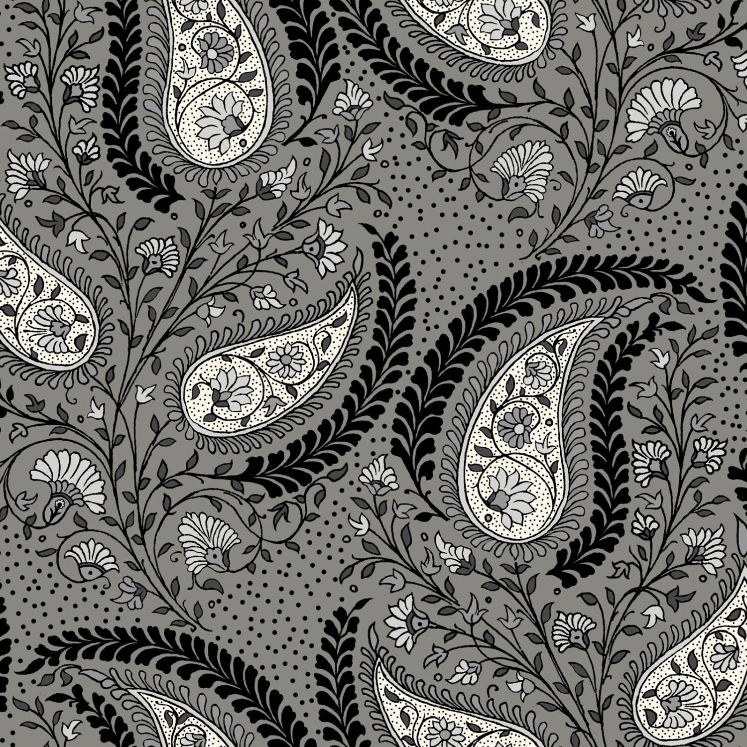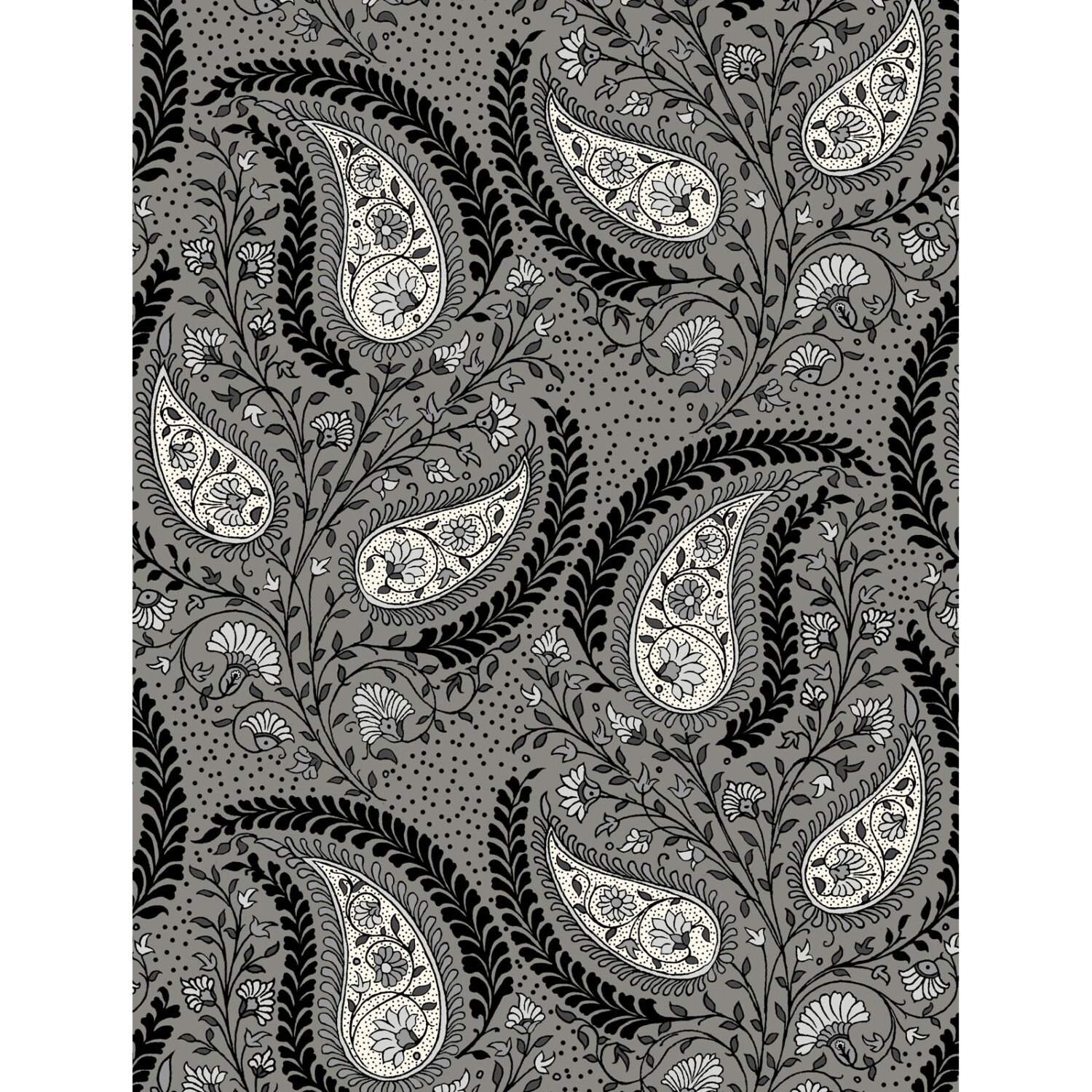 Tossed variable size paisley tear drop. Light and medium gray
